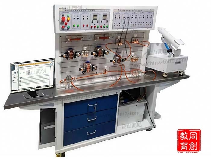 1.台架:采用整体式结构,主体框架为钣金结构,哑光喷塑烤漆,台面304不锈钢并设置集油槽,做实验时滴漏的油液可方便快速的从排油口排出并回收入废油壶。实训操作区域为带T型槽铝型材,脚轮采用带扳手福马轮;